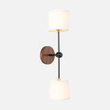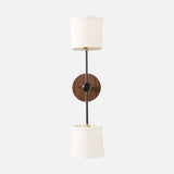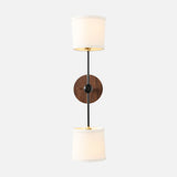 This wall sconce features two natural, American-made linen shades and a hand crafted hardwood backplate.