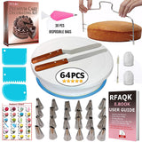 RFAQK 64 PCs Cake decorating supplies kit with Cake Turntable-Cake leveler-24 Numbered Piping Tips with Pattern Chart & EBook- Straight & Offset Spatula-30 Icings Bags- 3 Icing smoother Scraper set